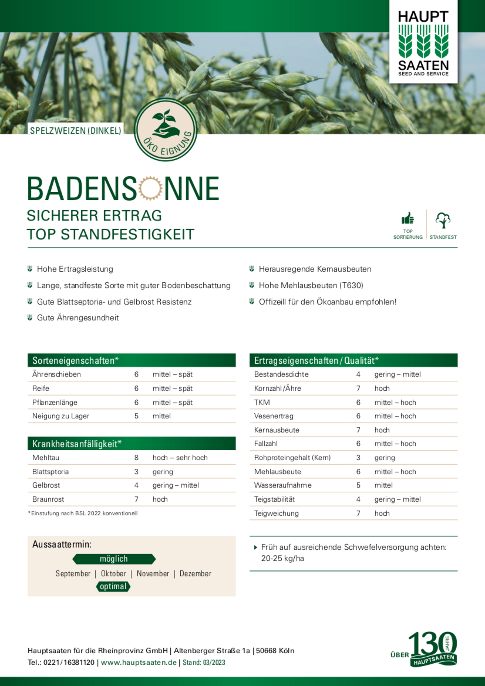 Diese Sortenbeschreibung mit den Hinweisen zur Bestandesführung sind auf Basis sorgfältig recherchierter offizieller und firmeninterner Versuchsergebnisse nach bestem Wissen und Gewissen erstellt. Trotzdem hängt der Erfolg der Kultur unter Praxisbedingungen auch von unsererseits nicht beeinflussbaren Faktoren ab, die nichts mit der Qualität und Leistungsfähigkeit der Sorte zu tun zu haben. Eine Gewähr oder Haftung können wir daher nicht übernehmen. Mit Erscheinen dieser Sorteninformationen werden frühere Ausgaben ungültig. Stand: 06/2023
