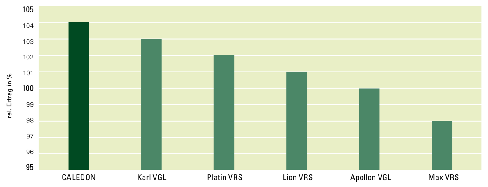 Quelle: WP 2021 – 2023 Kornertrag Ø 36 Standorte, Mittel aus Stufe 1 + 2, Vergleich CALEDON mit den im gleichen Zeitraum mitgeprüften VRS und VGL mit